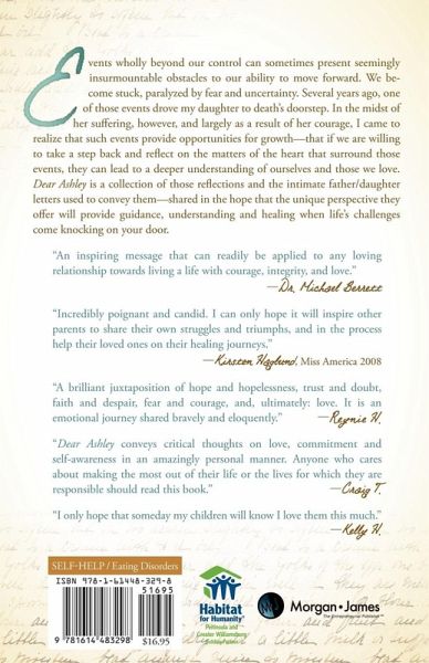 "Dear Ashley" is unique, in part, because it is not written from the perspective of the sufferer, the treatment professional or the medical or psychological researcher. Instead, it may be the first time a dad has shared his perspective on his daughter's eating disorder battle in print, let alone done so in such an engaging, intimate and heart-warming manner. The fact that Don Blackwell offers that perspective, openly and honestly, is one of many reasons parents and young adults are likely to be drawn to the book's life-affirming message of hope.