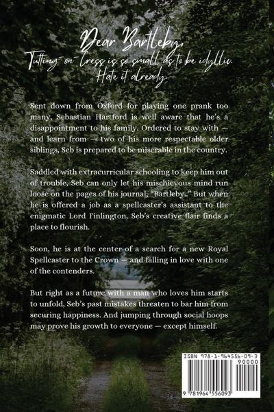 Dear Bartleby, Tutting-on-Cress is so small as to be idyllic. Hate it already. Sent down from Oxford for playing one prank too many, Sebastian Hartford is well aware that he's a disappointment to his family. Ordered to stay with - and learn from - two of his more respectable older siblings, Seb is prepared to be miserable in the country. Saddled with extracurricular schooling to keep him out of trouble, Seb can only let his mischievous mind run loose on the pages of his journal, "Bartleby." But when he is offered a job as a spellcaster's assistant to the enigmatic Lord Finlington, Seb's creative flair finds a place to flourish.Soon, he is at the center of a search for a new Royal Spellcaster to the Crown - and falling in love with one of the contenders. But right as a future with a man who loves him starts to unfold, Seb's past mistakes threaten to bar him from securing happiness. And jumping through social hoops may prove his growth to everyone - except himself.