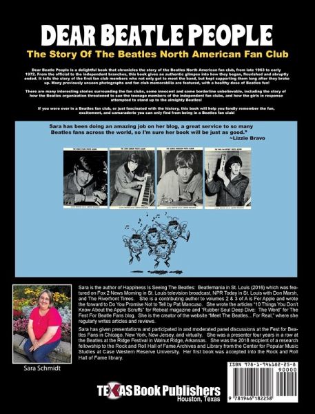 The story about the Beatles Fan Club in North America has never been told in over 50 years. This book tells the story of The Beatles fan clubs in the United States and Canada from 1963-1972. The Beatles had a lot of love and respect for their fan club members and frequently met them while they were touring North America. The stories of fan club members who met The Beatles are shared. The Official Beatles Fan Club in New York City did not meet the fans' expectations, so many quit and started independent fan clubs. When The Beatles stopped touring, the fan club members traveled to London, and many met John, Paul, George, and Ringo outside the recording studio and their homes. The Official Beatles Fan Club changed hands and threatened to sue the independent clubs, which was quite controversial. The fan club continued even after The Beatles had broken up and has impacted Beatles fans today. There have been thousands of Beatles books written since 1964. Their music and lives have been analyzed and dissected more than any other group of four men in history. However, this book differs from all other books on the market. This book does not focus on the Beatles' music or lives. Its focus is on the fans and how while being teenagers, they were able to organize and run successful fan clubs for The Beatles. The stories of how they were innovated to arrange an in-person meeting with The Beatles while on tour or in London have never been told. The story of the Beatles fan club in the United States has never been told before, and most Beatle fans are unfamiliar with this part of the Beatles' history. The story of how the Official Fan Club attempted to sue the independent fan clubs has yet to be spoken about since it occurred over 50 years ago. DEAR BEATLE PEOPLE INCLUDE: Previously unseen photographs. Beatles fan club memorabilia. Unheard stories about meeting the Beatles. Checklist of Beatles fan club memorabilia and photographs. Dear Beatle People will take you back to the 1960s to relive the Beatles fan club era and imagine what it was like to have been in a Beatles fan club. Remember the wild and crazy Teenage fan magazines that were popular in the 1960s, and have a new appreciation for the hard work and dedication it took to run a Beatles fan club.