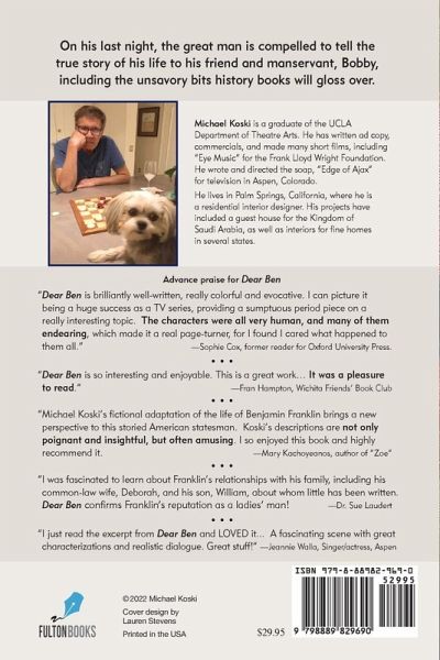 On his last night, the great man is compelled to tell the true story of his life to his friend and manservant, Bobby, including the unsavory bits history books will gloss over.Franklin knows he has only one night to atone for his sins. He has come to abhor slavery and offers to free Bobby, who hesitates, fearing the outside world. Bobby wants to know how his master rose from obscurity to wealth and fame. "Read my book," (his autobiography) Franklin tells him. "What's not in the book?" Bobby asks, unleashing the story of the unknown Benjamin Franklin.Franklin unfurls a sprawling saga of intrigue, romance, epic battles, love and loss. Bobby learns why Franklin never married his common-law wife, Deborah, or Margaret Stevenson, with whom he lived in London for fifteen years. Franklin tells a story fraught with illegitimate offspring, fathered by himself, his son, and his grandson. Who was the mother of his own bastard son, William? It is a confidence Bobby will take to his grave.Franklin's towering achievements in science and diplomacy are sullied by his tragic relationship with his son. Too long oblivious to William's treachery, he keeps him by his side as William weaves a pattern of betrayal and eventual treason. In a final meeting at Southampton, William begs his father for reconciliation and forgiveness, which Franklin fails to grant.Bobby's decision to accept Franklin's offer of freedom, only moments before Franklin succumbs, leads "Dear Ben" to a surprising conclusion.