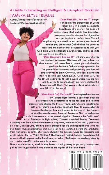 "Dear Black Girl, You are IT" wages war against the stereotypes of young black girls. In a world designed to keep black girls inferior, this book will inspire young black girls to love themselves completely and to destroy the stigma that was put in place to defeat them. You will stop looking at yourself as just ordinary, and instead, realize you are a Black Girl who has the power to transcend the barriers that are positioned to limit you. God gave you the strength, power, grace, and freedom to live your life in greatness. "Dear Black Girl, You Are IT" will show you who you are destined to become. This book will reverse how you view yourself and reveal how to renew your mind so that you love the Black Girl you are purposed to be. The powerful affirmations and provoking questions will empower you to ¿STEP FORWARD¿ into your destiny and start to become your future S.E.L.F. "Dear Black Girl, You Are IT" will inspire you to look beyond where you are now and help you to dream about your future Intelligent & Triumphant self. Black Girl, you are about to introduce a new S.E.L.F. to the world.