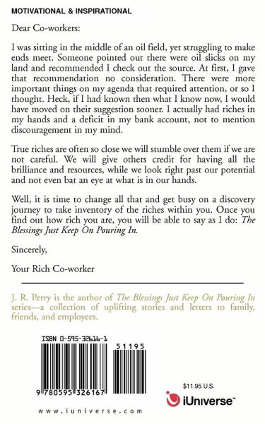 Dear Co-workers: I was sitting in the middle of an oil field, yet struggling to make ends meet. Someone pointed out there were oil slicks on my land and recommended I check out the source. At first, I gave that recommendation no consideration. There were more important things on my agenda that required attention, or so I thought. Heck, if I had known then what I know now, I would have moved on their suggestion sooner. I actually had riches in my hands and a deficit in my bank account, not to mention discouragement in my mind. True riches are often so close we will stumble over them if we are not careful. We will give others credit for having all the brilliance and resources, while we look right past our potential and not even bat an eye at what is in our hands. Well, it is time to change all that and get busy on a discovery journey to take inventory of the riches within you. Once you find out how rich you are, you will be able to say as I do: The Blessings Just Keep On Pouring In. Sincerely, Your Rich Co-worker