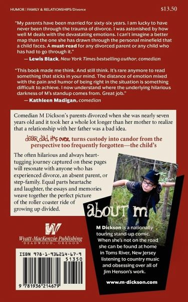 Comedian M Dickson's parents divorced when she was nearly seven years old and it took her a whole lot longer than her mother to realize that a relationship with her father was a bad idea. DEAR¿DAD, IT'S OVER. turns custody into candor one story at a time from the perspective too frequently forgotten, the child's. The often hilarious and always heart-tugging journey captured on these pages will resonate with anyone who has experienced divorce, an absent parent or step-family. Equal parts heartache and laughter, the essays and memories weave together the perfect picture of the roller coaster ride of growing up divided. About the Author M Dickson is a nationally touring stand-up comic. When she's not on the road she can be found at home in Toms River, New Jersey listening to country music and obsessing over all of Jim Henson's work.
