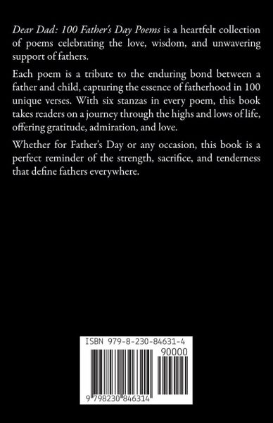 Dear Dad: 100 Father's Day Poems is a heartfelt collection of poems celebrating the love, wisdom, and unwavering support of fathers. Each poem is a tribute to the enduring bond between a father and child, capturing the essence of fatherhood in 100 unique verses. With six stanzas in every poem, this book takes readers on a journey through the highs and lows of life, offering gratitude, admiration, and love. Whether for Father's Day or any occasion, this book is a perfect reminder of the strength, sacrifice, and tenderness that define fathers everywhere.