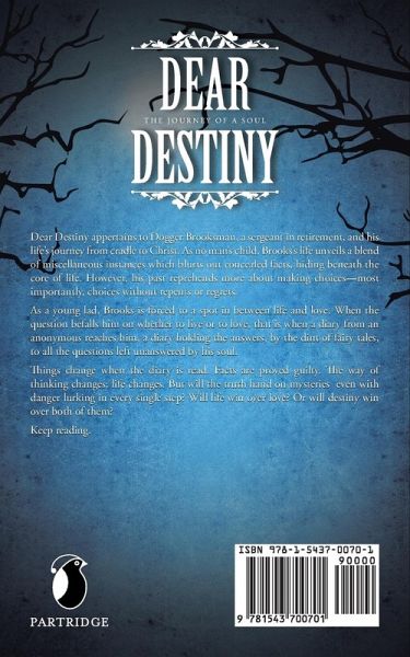 Dear Destiny appertains to Dogger Brooksman, a sergeant in retirement, and his life's journey from cradle to Christ. As no man's child, Brooks's life unveils a blend of miscellaneous instances which blurts out concealed facts, hiding beneath the core of life. However, his past reprehends more about making choices-most importantly, choices without repents or regrets. As a young lad, Brooks is forced to a spot in between life and love. When the question befalls him on whether to live or to love, that is when a diary from an anonymous reaches him, a diary holding the answers, by the dint of fairy tales, to all the questions left unanswered by his soul. Things change when the diary is read. Facts are proved guilty. The way of thinking changes; life changes. But will the truth hand on mysteries even with danger lurking in every single step? Will life win over love? Or will destiny win over both of them? Keep reading.