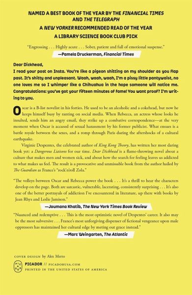 A New Yorker best book of 2024 A Financial Times Best Translated Book of 2024 Shortlisted for the American Literary Translators Association National Translation Award in Prose Nominated for the DUBLIN Literary Award Library Science September book club pick A Vulture most anticipated book One of The New York Times' 24 works of fiction to read of fall 2024 A Guardian best translated fiction pick A Town & Country must-read fall book "It's a thrill to hear the characters develop on the page . . . One of the better portrayals of addiction I've encountered in literature, up there with books by Jean Rhys and Leslie Jamison." -Joumana Khatib, The New York Times Book Review "Engrossing . . . Full of emotional suspense." -Pamela Druckerman, Financial Times The French novel taking the world by storm: an ultracontemporary Dangerous Liaisons about sex, feminism, and addiction. Dear Dickhead, I read your post on Insta. You're like a pigeon shitting on my shoulder as you flap past. It's shitty and unpleasant. Waah, waah, waah, I'm a pissy little pantywaist, no one loves me so I whimper like a Chihuahua in the hope someone will notice me. Congratulations: you've got your fifteen minutes of fame! You want proof? I'm writing to you. Oscar is a B-list novelist in his forties. He used to be an alcoholic and a cokehead, but now he keeps himself busy by ranting on social media. When Rebecca, an actress whose looks he insulted, sends him an angry email, they strike up a combative correspondence-at the very moment that Oscar is accused of sexual harassment by his former publicist. What ensues is a no-holds-barred conversation about life under the patriarchy, and above all about addiction-to drugs, to alcohol, to the internet, to rage. Virginie Despentes, the celebrated author of King Kong Theory, has written her breakthrough book: a Dangerous Liaisons for our time. We follow Rebecca and Oscar as they develop an unlikely friendship and argue over questions of right and wrong in a city-Paris-where pleasure, excess, and freedom rule the day, or used to. Dear Dickhead is a guns-blazing novel about a culture that makes men and women sick, and about how the search for feeling leaves us addicted to what makes us feel. The result is a provocative and unmissable book from the author hailed by The Guardian as France's "rock and roll Zola."