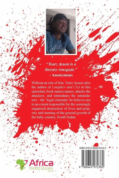 "Tearz Ayuen is a literary renegade." - Anonymous Without an iota of fear, Tearz Ayuen - also the author of Laughter and Cry - in this epistolary book names names, attacks the attackers, and intimidates the intimidators - the 'legal criminals' he believes are to an extent responsible for the seemingly organized destruction of lives and property and stunting of the general growth of the baby country, South Sudan. "Warning: Do not read this book." Said Tearz Ayuen