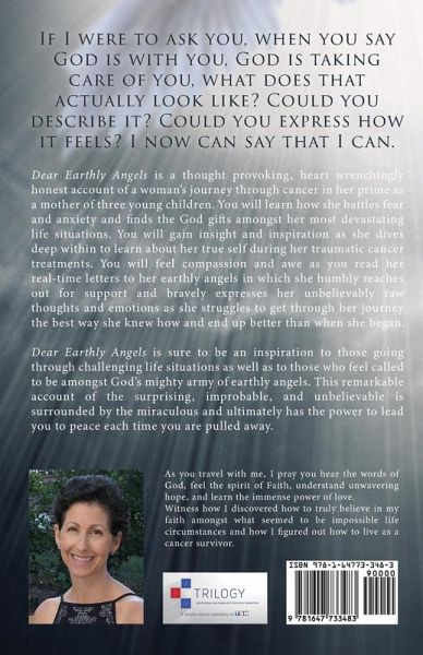 If I were to ask you, when you say God is with you, God is taking care of you, what does that actually look like? Could you describe it? Could you express how it feels? I now can say that I can. Dear Earthly Angels is a thought provoking, heart wrenchingly honest account of a woman's journey through cancer in her prime as a mother of three young children. You will learn how she battles fear and anxiety and finds the God gifts amongst her most devastating life situations. You will gain insight and inspiration as she drives deep within to learn about her true self during her traumatic cancer treatments. You will feel compassion and awe as you read her real-time letters to her earthly angels in which she humbly reaches out for support and bravely expresses her unbelievably raw thoughts and emotions as she struggles to get through her journey the best way she knew how and end up better than when she began. Dear Earthly Angels is sure to be an inspiration to those going through challenging life situations as well as to those who feel called to be amongst God's mighty army of earthly angels. This remarkable account of the surprising, improbable, and unbelievable is surrounded by the miraculous and ultimately has the power to lead you to peace each time you are pulled away.
