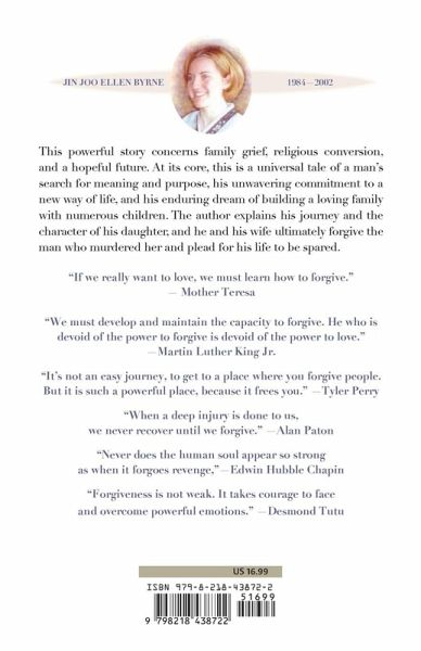 This impactful story delves into themes of family tragedy and one man's pursuit of truth and purpose. It is a deeply personal letter addressed to the man who murdered his eighteen-year-old daughter. The author shares all aspects of his life journey, including growing up in New Zealand, moving to America, getting married, and living on a remote island in the Gulf of Alaska for twelve years before settling in Seattle. He intertwines his experiences with influential religious figures who served as mentors in his life and guided his faith and commitment to his spiritual path. This narrative is a timeless tale of a man's unwavering dedication to his faith, marriage, and family, demonstrating the courage to pursue a spiritual path of genuine virtue. It exemplifies the transformative power of forgiveness, which can heal even the deepest wounds and bring about profound change. The author ardently yearns to convey his eldest daughter's spirit of goodness, grace, and beauty to her assailant. Her unwavering commitment to purity, her sincere passion for one true love, and her fight to protect her innocence are a testament to her spirit. The author shares the heartbreak of losing his daughter and how his and his wife's faith played a pivotal role in their decision to undergo the delicate and transformative process of forgiving the man who took her life and ultimately pleading for his life.