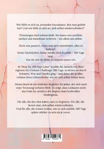 Wie fühlt es sich an, jemanden loszulassen, den man geliebt hat? Und wie fühlt es sich an, sich selbst wiederzufinden?Trennungen sind nie einfach. Sie hinterlassen Narben, Zweifel und oft das Gefühl, sich selbst verloren zu haben. Doch was, wenn man sich bewusst dafür entscheidet, einen neuen Weg einzuschlagen? Keine Nachrichten, keine Anrufe, kein Kontakt - 100 Tage lang. Genau diese Reise hat die Autorin unternommen, und dieses Buch ist das ehrliche und ungeschönte Protokoll ihrer Erfahrungen."Dear Ex, 100 Days Later" nimmt dich mit auf eine emotionale Reise durch Schmerz, Wut, Einsicht und Heilung. Es zeigt, wie es ist, den Mut aufzubringen, loszulassen, und wie man Schritt für Schritt zu sich selbst zurückfindet. In 100 klar strukturierten Tagen offenbart die Autorin, wie sie sich mit jedem Tag ein Stück mehr selbst geheilt hat.Dieses Buch ist für dich, wenn:du mitten in einer Trennung steckst und Orientierung suchst,du wissen willst, wie es sich anfühlt, nach einer Trennung wieder aufzublühen,du dich selbst an die erste Stelle setzen möchtest, ohne Kompromisse.Ehrlich. Inspirierend. Ermächtigend.Dieses Buch zeigt, dass Loslassen nicht das Ende ist - sondern der Anfang von etwas Wundervollem.Lies "Dear Ex, 100 Days Later" und entdecke, wie du in 100 Tagen stärker, freier und glücklicher wirst.