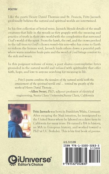 Like the poets Henry David Thoreau and St. Francis, Fritz Jaensch profoundly believes the natural and spiritual worlds are intertwined. In his first collection of lyrical verse, Jaensch blends details of the small creatures that hide in the woods as they grapple with the meaning and practice of truth in their own world with the complexities that surround Gods world of the spirit. From the hawk, the owl, and the crows perched in the tall trees to Gods chosen vesselhis sonwho has come to Earth to redeem the human soul, Jaensch leads others down a peaceful path where warm sunshine heals pain and the word of God brings comfort to the sick and weary. In this poignant volume of verse, a poet shares contemplative lyrics grounded in the natural world and infused with spirituality that offer faith, hope, and love to anyone searching for meaning in life. Fritzs poems combine the wonders of the natural world with the amazement of the spiritual world and remind me greatly of the works of Henry David Thoreau Allen Sweet, PhD, adjunct professor of electrical engineering, Santa Clara University, Santa Clara, California