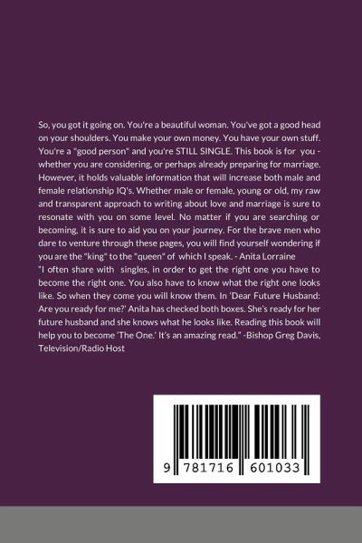 So you got it going on. You're a beautiful woman. You've got a good head on your shoulders. You make your own money. You have your own stuff. You're a "good person" and you're STILL SINGLE. This book is for you - whether you are considering, or perhaps already preparing for marriage. However, it holds valuable information that will increase both male and female relationship IQ's. Whether male or female, young or old, my raw and transparent approach to writing about love and marriage is sure to resonate with you on some level. No matter if you are searching or becoming, it is sure to aid you on your journey. For the brave men who dare to venture through these pages, you will find yourself wondering if you are the "king" to the "queen" of which I speak. -Anita Lorraine "I often share with singles, in order to get the right one you have to become the right one. You also have to know what the right one looks like. So when they come you will know them. In 'Dear Future Husband: Are you ready for me?' Anita has checked both boxes. She's ready for her future husband and she knows what he looks like. Reading this book will help you to become 'The One.' It's an amazing read. -Bishop Greg Davis, Television/Radio Host