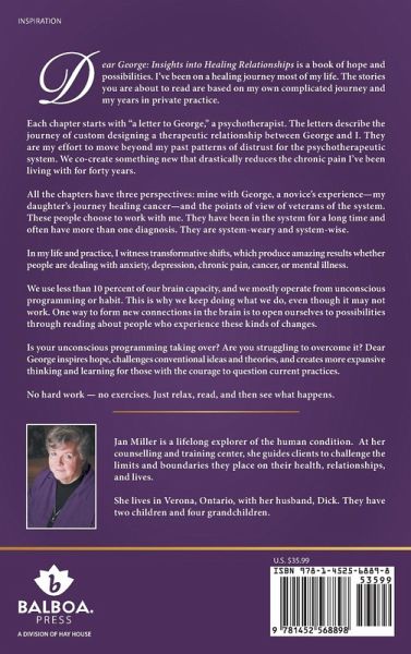 Dear George: Insights into Healing Relationships is a book of hope and possibilities. I've been on a healing journey most of my life. The stories you are about to read are based on my own complicated journey and my years in private practice. Each chapter starts with "a letter to George," a psychotherapist. The letters describe the journey of George and me custom designing a therapeutic relationship. They are my effort to move beyond my past patterns of distrust for the psychotherapeutic system. We co-create something new that drastically reduces the chronic pain I've been living with for forty years. All the chapters have three perspectives: mine with George, a novice's experience-my daughter's journey healing cancer-and the points of view of veterans of the system. These people choose to work with me. They have been in the system for a long time and often have more than one diagnosis. They are system-weary and system-wise. In my life and practice, I witness transformative shifts, which produce amazing results whether people are dealing with anxiety, depression, chronic pain, cancer, or mental illness. We use less than 10 percent of our brain capacity, and we mostly operate from unconscious programming or habit. This is why we keep doing what we do, even though it may not work. One way to form new connections in the brain is to open ourselves to possibilities through reading about people who experience these kinds of changes. Is your unconscious programming taking over? Are you struggling to overcome it? Dear George inspires hope, challenges conventional ideas and theories, and creates more expansive thinking and learning for those with the courage to question current practices. No hard work - no exercises. Just relax, read, and then see what happens.