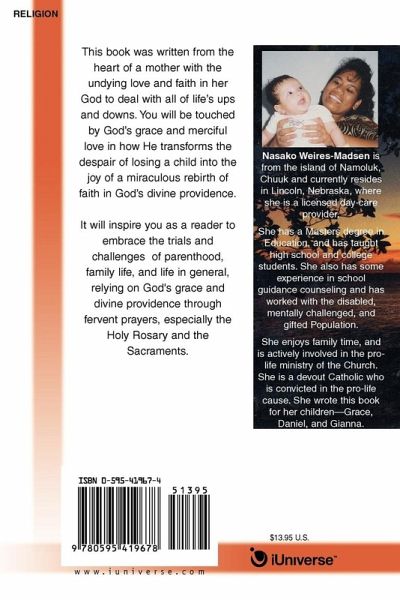 This book was written from the heart of a mother with the undying love and faith in her God to deal with all of life's ups and downs. You will be touched by God's grace and merciful love in how He transforms the despair of losing a child into the joy of a miraculous rebirth of faith in God's divine providence. It will inspire you as a reader to embrace the trials and challenges of parenthood, family life, and life in general, relying on God's grace and divine providence through fervent prayers, especially the Holy Rosary and the Sacraments.