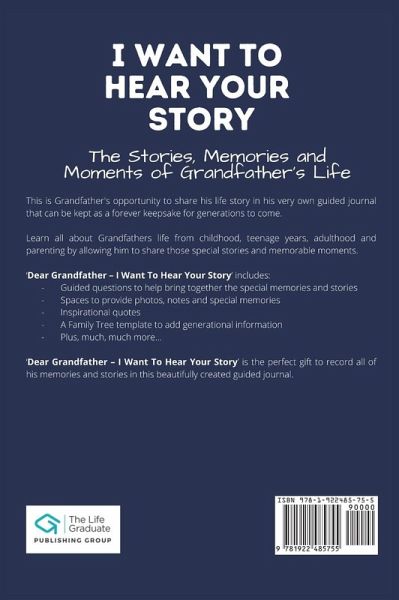 This is Grandfather's opportunity to share his life story in his very own guided journal that can be kept as a forever keepsake for generations to come. Learn all about Grandfather's life from childhood, teenage years, adulthood and parenting by allowing him to share those special stories and memorable moments. 'Dear Grandfather - I Want To Hear Your Story' includes: - Guided questions to help bring together the special memories and stories that may never have been asked or shared before. - Spaces to provide photos, notes and special memories - Inspirational quotes - A Family Tree template to add generational information - Plus, much, much more... 'Dear Grandfather - I Want To Hear Your Story' is the perfect gift to record all of his memories and stories in this beautifully created guided journal.