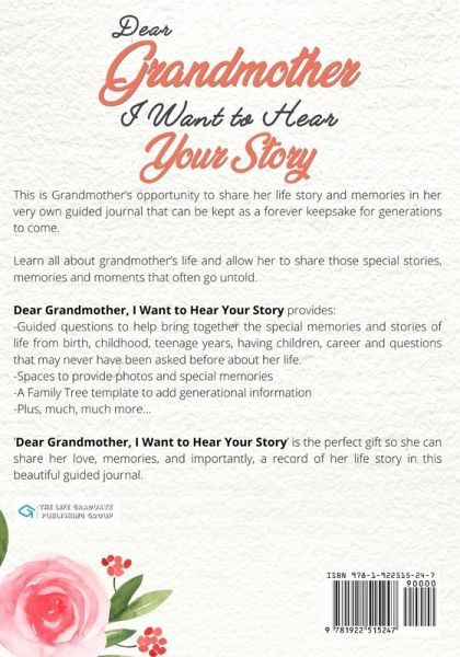 Give Grandmother this beautifully designed 'guided journal' so she can record her memories, stories, and events that can be reflected back on for generations to come. 'Dear Grandmother, I Want To Hear Your Story will provide mothers with the opportunity to share their special stories and memorable moments with their children, family and as a keepsake for generations to come. Imagine having the opportunity to capture all of those key moments and stories in grandmother's life that you can reflect on and cherish for years to come. This journal is not just a gift for grandmother, but a memory that will last a lifetime. This unique book provides: Guiding Questions: Will help bring together the special memories and stories of life from birth, childhood, teenage years, parenting, career, and questions that may never have been asked before Memory Pages: Included to provide spaces to include photos, certificates and special memories Large Format: Designed in a 7 x 10 inch format to include all those special memories A Family Tree template: to add generational information 'Dear Grandmother, I Want to Hear Your Story' is the perfect gift so she can share her thoughts, memories, and importantly, a record of her life story in this beautiful journal. Purchase this gift today, for a memory that will last a lifetime.