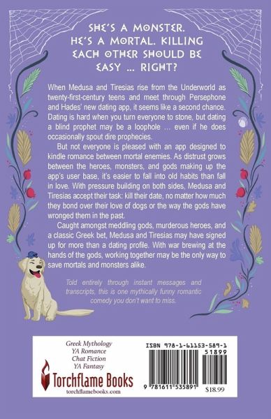 She's a monster. He's a mortal. Killing each other should be easy...right? When Medusa and Tiresias rise from the Underworld as twenty-first-century teens and meet through Persephone and Hades' new dating app, it seems like a second chance. Dating is hard when you turn everyone to stone, but dating a blind prophet may be a loophole ... even if he does occasionally spout dire prophecies. But not everyone is pleased with an app designed to kindle romance between mortal enemies. As distrust grows between the heroes, monsters, and gods making up the app's user base, it's easier to fall into old habits than fall in love. With pressure building on both sides, Medusa and Tiresias accept their task: kill their date, no matter how much they bond over their love of dogs or the way the gods have wronged them in the past. Caught amongst meddling gods, murderous heroes, and a classic Greek bet, Medusa and Tiresias may have signed up for more than a dating profile. With war brewing at the hands of the gods, working together may be the only way to save mortals and monsters alike. Told entirely through instant messages and transcripts, this is one mythically funny romantic comedy you don't want to miss.