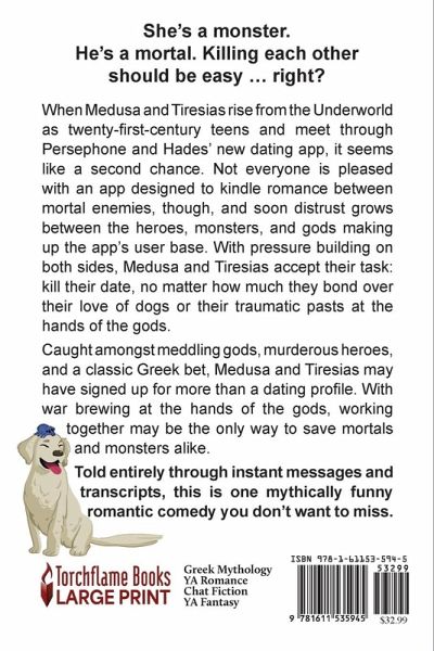 She's a monster. He's a mortal. Killing each other should be easy...right? When Medusa and Tiresias rise from the Underworld as twenty-first-century teens and meet through Persephone and Hades' new dating app, it seems like a second chance. Dating is hard when you turn everyone to stone, but dating a blind prophet may be a loophole ... even if he does occasionally spout dire prophecies. But not everyone is pleased with an app designed to kindle romance between mortal enemies. As distrust grows between the heroes, monsters, and gods making up the app's user base, it's easier to fall into old habits than fall in love. With pressure building on both sides, Medusa and Tiresias accept their task: kill their date, no matter how much they bond over their love of dogs or the way the gods have wronged them in the past. Caught amongst meddling gods, murderous heroes, and a classic Greek bet, Medusa and Tiresias may have signed up for more than a dating profile. With war brewing at the hands of the gods, working together may be the only way to save mortals and monsters alike. Told entirely through instant messages and transcripts, this is one mythically funny romantic comedy you don't want to miss.