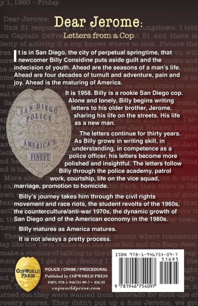 It is in San Diego, the city of perpetual springtime, that newcomer Billy Considine puts aside guilt and the indecision of youth. Ahead are the seasons of a man’s life. Ahead are four decades of tumult and adventure, pain and joy. Ahead is the maturing of America. It is 1958. Billy is a rookie San Diego cop. Alone and lonely, Billy begins writing letters to his older brother, Jerome, sharing his life on the streets. His life as a new man. The letters continue for thirty years. As Billy grows in writing skill, in understanding, in competence as a police officer, his letters become more polished and insightful. The letters follow Billy through the police academy, patrol work, courtship, life on the vice squad, marriage, promotion to homicide. Billy’s journey takes him through the civil rights movement and race riots, the student revolts of the 1960s, the counterculture/anti-war 1970s, the dynamic growth of San Diego and of the American economy in the 1980s. Billy matures as America matures. It is not always a pretty process.