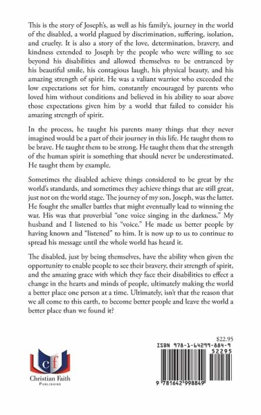 This is the story of Joseph's, as well as his family's, journey in the world of the disabled, a world plagued by discrimination, suffering, isolation, and cruelty. It is also a story of the love, determination, bravery, and kindness extended to Joseph by the people who were willing to see beyond his disabilities and allowed themselves to be entranced by his beautiful smile, his contagious laugh, his physical beauty, and his amazing strength of spirit. He was a valiant warrior who exceeded the low expectations set for him, constantly encouraged by parents who loved him without conditions and believed in his ability to soar above those expectations given him by a world that failed to consider his amazing strength of spirit. In the process, he taught his parents many things that they never imagined would be a part of their journey in this life. He taught them to be brave. He taught them to be strong. He taught them that the strength of the human spirit is something that should never be underestimated. He taught them by example. Sometimes the disabled achieve things considered to be great by the world's standards, and sometimes they achieve things that are still great, just not on the world stage. The journey of my son, Joseph, was the latter. He fought the smaller battles that might eventually lead to winning the war. His was that proverbial "one voice singing in the darkness." My husband and I listened to his "voice." He made us better people by having known and "listened" to him. It is now up to us to continue to spread his message until the whole world has heard it. The disabled, just by being themselves, have the ability when given the opportunity to enable people to see their bravery, their strength of spirit, and the amazing grace with which they face their disabilities to effect a change in the hearts and minds of people, ultimately making the world a better place one person at a time. Ultimately, isn't that the reason that we all come to this earth, to become better people and leave the world a better place than we found it?