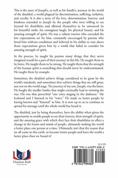 This is the story of Joseph's, as well as his family's, journey in the world of the disabled, a world plagued by discrimination, suffering, isolation, and cruelty. It is also a story of the love, determination, bravery, and kindness extended to Joseph by the people who were willing to see beyond his disabilities and allowed themselves to be entranced by his beautiful smile, his contagious laugh, his physical beauty, and his amazing strength of spirit. He was a valiant warrior who exceeded the low expectations set for him, constantly encouraged by parents who loved him without conditions and believed in his ability to soar above those expectations given him by a world that failed to consider his amazing strength of spirit. In the process, he taught his parents many things that they never imagined would be a part of their journey in this life. He taught them to be brave. He taught them to be strong. He taught them that the strength of the human spirit is something that should never be underestimated. He taught them by example. Sometimes the disabled achieve things considered to be great by the world's standards, and sometimes they achieve things that are still great, just not on the world stage. The journey of my son, Joseph, was the latter. He fought the smaller battles that might eventually lead to winning the war. His was that proverbial "one voice singing in the darkness." My husband and I listened to his "voice." He made us better people by having known and "listened" to him. It is now up to us to continue to spread his message until the whole world has heard it. The disabled, just by being themselves, have the ability when given the opportunity to enable people to see their bravery, their strength of spirit, and the amazing grace with which they face their disabilities to effect a change in the hearts and minds of people, ultimately making the world a better place one person at a time. Ultimately, isn't that the reason that we all come to this earth, to become better people and leave the world a better place than we found it?