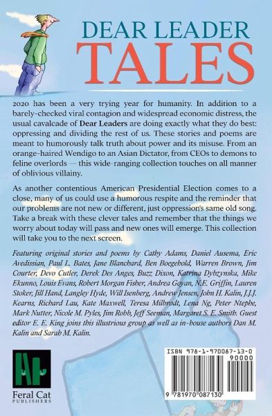 2020 has been a very trying year for humanity. In addition to a barely-checked viral contagion and widespread economic distress, the usual cavalcade of Dear Leaders are doing exactly what they do best: oppressing and dividing the rest of us. These stories and poems are meant to humorously talk truth about power and its misuse. From an orange-haired Wendigo to an Asian Dictator, from CEOs to demons to feline overlords - this wide-ranging collection touches on all manner of oblivious villainy. As another contentious American Presidential Election comes to a close, many of us could use a humorous respite and the reminder that our problems are not new or different, just oppression's same old song. Take a break with these clever tales and remember that the things we worry about today will pass and new ones will emerge. This collection will take you to the next screen. Featuring original stories and poems by Cathy Adams, Daniel Ausema, Eric Avedissian, Paul L. Bates, Jane Blanchard, Ben Boegehold, Warren Brown, Jim Courter, Devo Cutler, Derek Des Anges, Buzz Dixon, Katrina Dybzynska, Mike Ekunno, Louis Evans, Robert Morgan Fisher, Andrea Goyan, N.E. Griffin, Lauren Stoker, Jill Hand, Langley Hyde, Will Isenberg, Andrew Jensen, John H. Kalin, J.J.J. Kearns, Richard Lau, Kate Maxwell, Teresa Milbrodt, Lena Ng, Peter Ntephe, Mark Nutter, Nicole M. Pyles, Jim Robb, Jeff Seeman, Margaret S. E. Smith. Guest editor E. E. King joins this illustrious group as well as in-house authors Dan M. Kalin and Sarah M. Kalin.