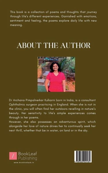 ""Dr Archana Pimpalnerkar Kulkarni born in India, is a consultant Ophthalmic surgeon practicing in England. When she is not in the clinic, you will often find her gardening. Her sensitivity to life's simple experiences comes through in her poems. Her adventurous spirit and love of nature drives her to seek her next thrill in the outdoors, whether that be on land, in the water or in the sky.""