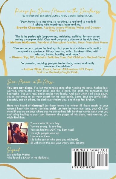 Whether you are a parent of a kiddo with cancer, a heart condition, diabetes, cerebral palsy or a thousand other things that have you pacing hospital floors with your child, this book is for you. If you are someone on the sidelines watching helplessly, this book is for you. If you are a medical provider seeking understanding, this is for you. Between the pages of Dear Mama in the Darkness, Hilary Camille Thompson,CLC, is hoping parents find encouragement, hope, inspiration, compassion, and perhaps a perspective that will help them to see the challenge of raising a medically complex child in a different light. Hilary's unique, refreshingly simple, practical, and inspiring approach to their family's situation has blessed her with the ability to serve adults and teens' across the country in her online mental health coaching practice. Mama to two great kids, (one on her second heart), she remains a tireless advocate for medical families in her "spare time," and is now an international best-selling author. The letters in Dear Mama in the Darkness were written over a period of eleven years, as a testament to the tools she found that enabled her to find joy, even when things were hard; to become better, not bitter. Often parents with sick kids feel alone, exhausted, emotionally drained, existing in a state of survival. Often friends, relatives, neighbors, and social workers are at a loss with ways to support, let alone understand. There are many books that offer ways to help our children in these situations, but very few that offer encouragement and mental health support for the parents. That's where Hilary comes in. Poetic at times, tear-jerking, funny, emotionally authentic and sometimes very raw, these letters are meant to empower, inspire, and bless anyone who is fortunate enough to be involved in the care of a sick child. Hilary's hope is that, whether you are in a hospital, or your living room, or you're falling into bed after another exhausting day parenting a sick kiddo, that these pages will bless your "brokenness" with a bit of gold, much like the Japanese art of kintsugi. These children need (more than almost anything) a parent who is emotionally well-supported and whole to care for them. No one has to be in the Darkness alone. Hilary is here to sit with you in it...and she's brought a lantern (and a latte).