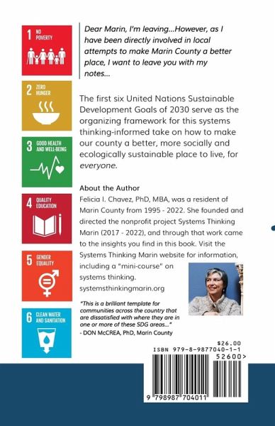 Former Marin County community organizer and promoter of "systems thinking" shares her first-person voice following on insights gathered over five years of local experience. This book is full of specific datapoints, examples, and suggestions for making the world a better place, beginning with Marin County residents learning more about the very real challenges within their own community. The focus is on Marin County, California, but Marin is contextualized within and compared to California, the Untied States, and in some cases, the globe. Each issue area - organized by the first six United Nations Sustainable Development Goals of 2030 - is looked at from existing reports, but also, a systems worldview. This means that each issue area is considered in the context of related issues, a long-term perspective, and the role of relationships - of all kinds - and how these factors impact our collective ability to alleviate the challenges related to each. The author makes a concerted effort to include information about Native North American groups as they are often left out of collective reports for various reasons.