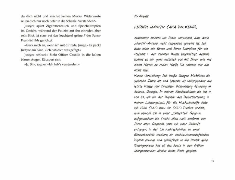 Mit Briefen an sein großes Vorbild Martin Luther King Jr. versucht Justyce, dem alltäglichen Rassismus etwas entgegenzusetzen. Und dann ist da noch Sarah-Jane, seine kluge, schöne - und weiße - Debattierpartnerin. Als jedoch sein bester Freund Manny erschossen wird, scheint es, als ob selbst Martin Luther King Jr. keine Antwort mehr für Justyce bereithält.