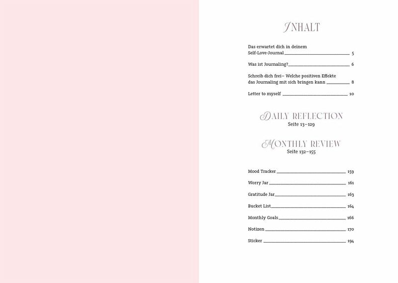 Daily und Monthly Reflections: Strukturiertes Journaling für tägliche und monatliche Reflexion, um dich selbst besser kennenzulernen und deine Gedanken bewusst zu ordnenGanzheitlicher Self-Love-Ansatz: Mit Habit Tracker, Worry Jar und Gratitude Jar hast du praktische Tools, um Routinen zu etablieren, Sorgen loszulassen und mehr Dankbarkeit in deinen Alltag zu bringenMotivation und Visionen: Inspirierende Sprüche, ein Brief an dich selbst und eine Bucketlist - Erkenne, was dich wirklich glücklich machtBonus: Hochwertige Sticker, mit denen du dein Journal noch persönlicher und schöner gestalten kannst
