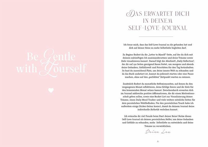 Das Self-Love Journal von Autorin und Content Creatorin Lea Pietsch ist mehr als nur ein Journal. Es ist dein persönlicher Safe Space, ein Rückzugsort, an dem du reflektieren, wachsen und lernen kannst, dich selbst mit mehr Liebe zu sehen. Es erinnert dich jeden Tag daran, dass du wertvoll bist - unabhängig von Erwartungen, Likes oder To-Do-Listen. Denn echte Selbstliebe beginnt nicht im Außen, sondern in dir.