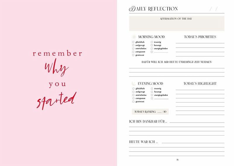Dieses Journal ist ein praktisches Werkzeug und dein Begleiter auf dem Weg zu mehr Selbstliebe. Mit jedem Eintrag wirst du dir selbst näher kommen und deine persönliche Weiterentwicklung aufgreifen. Ganz egal, wo du gerade stehst: Starte jetzt und mach dich selbst zur Priorität!