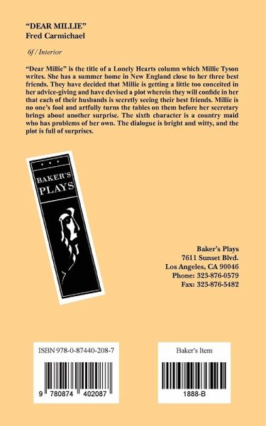A Comedy in One Act for Six Women Fred Carmichael Characters: 6 female. Interior Set "Dear Millie" is the title of a Lonely Hearts column which Millie Tyson writes. She has a summer home in New England close to her three best friends. They have decided that Millie is getting a little too conceited in her advice-giving and have devised a plot wherein they will confide in her that each of their husbands is secretly seeing their best friends. Millie is no one's fool and artfully turns the tables on them before her secretary brings about another surprise. The sixth character is a country maid who has problems of her own. The dialogue is bright and witty, and the plot full of surprises.