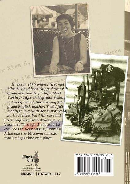 It was in 1959 when I first met Miss B. I had been skipped over 6th grade and sent to Jr High, Mark Twain Jr High on Neptune Avenue in Coney Island. She was my 7th grade English teacher. That I fell madly in love with her is not really an issue here, but I for sure did. It’s a long way from Brooklyn to Vietnam. Through a surprise package of fifty-year-old letters he explores in Dear Miss B, Dominic Albanese (re-)discovers a road that bridges time and place.