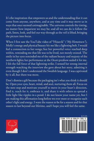 It's the inspiration that empowers us and the understanding that it can come from anyone, anywhere, and at any time and it may move us in ways that once seemed unimaginable. The universe controls the timing, no matter how impatient we may be; and all we can do is follow the path, listen, look, and feel our way through as the veil is lifted, bringing the picture into focus. When I first saw the YouTube video of "Husavik" ("My Hometown"), Molly's energy and physical beauty hit me like a lightning bolt. I would feel a connection to her songs; but her powerful voice reached deep within, reminding me that life was to be lived, not merely existed. The smile in her eyes reminded me of the radiant beauty and majesty of the northern lights; her performance at the Oscars preshow sealed it for me. I felt the full force of that lightning strike. I sensed her strong internal strength watching the interview she gave about her story, admiring it even though I don't understand the Swedish language. I was captivated by it all, but there was more. Don't dismiss a gift because the packaging isn't what you think it should be. Open your eyes, heart, mind, and soul, nurturing them all. Focus on the next step and motivate yourself to move in your heart's direction, find it, reach for it, embrace it, and share it with others to spread a little light like ripples in a pond. I do not know your name yet, but I am making this affirmation long before we ever meet or recognize each other's light and energy. I want the reason to be for a season and for that season to last beyond our lifetime, and I hope you will feel the same.