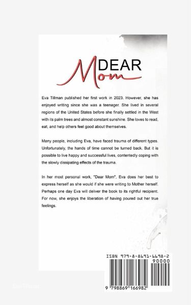 Eva Tillman published her first work in 2023. However, she has been writing since she was a teenager. She was raised in St. Paul, MN and lived in several regions of the US before she settled in the West with its palm trees and constant sunshine. She loves to read and help others feel good about themselves.Many people, including Eva, have faced trauma of different types. Unfortunately, the hands of time cannot be turned back. But it is possible to live happy, successful lives, contentedly coping with the slowly dissipating effects of trauma.In her most personal work, "Dear Mom: A Letter I Will Never Send, To A Mother Who Would Never Read It Anyway," published June 1, 2023, Eva does her best to write as if she were writing to Mother herself, the unfortunate source of most of the trauma. Having tackled that monster, she went on to write a romantic comedy "Gracie's Bright Eyes Are Closed Tight," (March 13, 2024) and a book of poetry "Angst to Ascension:The Poetic Thoughts of a Survivor," (June 1, 2024).She now enjoys reading and reviewing works of historical fiction, psychological thrillers, and more.