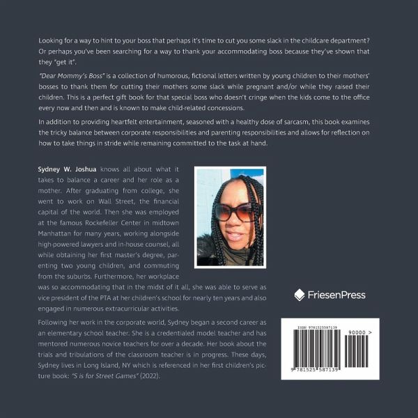 Looking for a way to hint to your boss that perhaps it's time to cut you some slack in the childcare department? Or perhaps you've been searching for a way to thank your accommodating boss because they've shown that they "get it". Dear Mommy's Boss is a collection of humorous, fictional letters written by young children to their mothers' bosses to thank them for cutting their mothers some slack while pregnant and/or while they raised their children. This is a perfect gift book for women to give to their bosses as a form of thanks when going on or returning from a maternity leave or vacation or on other special occasions when they want to express their thanks to their employers for making child-related concessions. In addition to providing heartfelt entertainment, seasoned with a healthy dose of sarcasm, this book examines the tricky balance between corporate responsibilities and parenting responsibilities and allows for reflection on how to take things in stride while remaining committed to the task at hand.