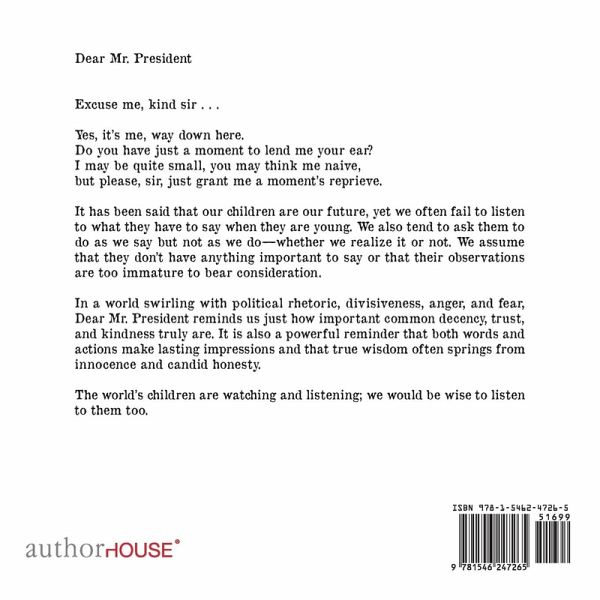 Dear Mr. President Excuse me, kind sir . . . Yes, its me, way down here. Do you have just a moment to lend me your ear? I may be quite small, you may think me naive, but please, sir, just grant me a moments reprieve. It has been said that our children are our future, yet we often fail to listen to what they have to say when they are young. We also tend to ask them to do as we say but not as we dowhether we realize it or not. We assume that they dont have anything important to say or that their observations are too immature to bare consideration. In a world swirling with political rhetoric, divisiveness, anger, and fear, Dear Mr. President reminds us just how important common decency, trust, and kindness truly are. It is also a powerful reminder that both words and actions make lasting impressions and that true wisdom often springs from innocence and candid honesty. The worlds children are watching and listening; we would be wise to listen to them too.