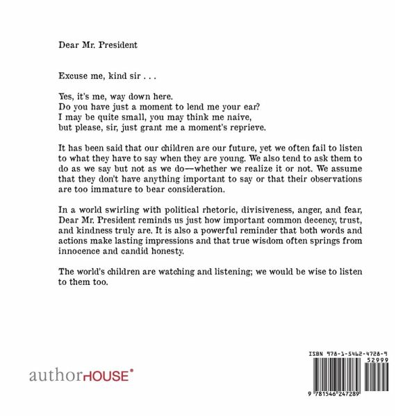Dear Mr. President Excuse me, kind sir . . . Yes, its me, way down here. Do you have just a moment to lend me your ear? I may be quite small, you may think me naive, but please, sir, just grant me a moments reprieve. It has been said that our children are our future, yet we often fail to listen to what they have to say when they are young. We also tend to ask them to do as we say but not as we dowhether we realize it or not. We assume that they dont have anything important to say or that their observations are too immature to bare consideration. In a world swirling with political rhetoric, divisiveness, anger, and fear, Dear Mr. President reminds us just how important common decency, trust, and kindness truly are. It is also a powerful reminder that both words and actions make lasting impressions and that true wisdom often springs from innocence and candid honesty. The worlds children are watching and listening; we would be wise to listen to them too.