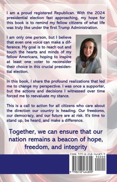 I am a proud registered Republican. With the 2024 presidential election fast approaching, my hope for this book is to remind my fellow citizens of what life was truly like under the first Trump Administration. I am only one person, but I believe that even one voice can make a difference. My goal is to reach out and touch the hearts and minds of my fellow Americans, hoping to inspire at least one voter to reconsider their choice in this crucial presidential election. In this book, I share the profound realizations that led me to change my perspective. I was once a supporter, but the actions and decisions I witnessed over time forced me to reevaluate my stance. This is a call to action for all citizens who care about the direction our country is heading. Our freedoms, our democracy, and our future are at risk. It's time to stand up, be heard, and make a difference. Together, we can ensure that our nation remains a beacon of hope, freedom, and integrity.