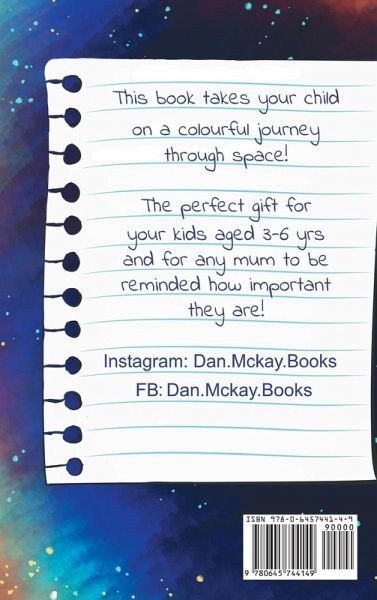 A child leaves a note for his mum and goes on an adventure to the moon. He has lots of fun and adventures but realizes that he belongs at home with his mother. This book is a colorful adventure for kids and a reminder to all mums that they are special.
