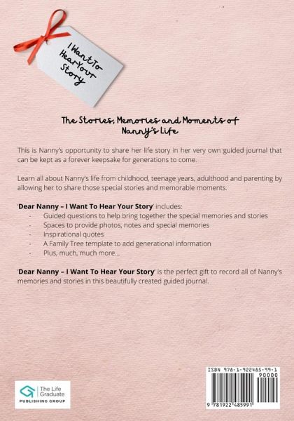 This is Nanny's opportunity to share her life story in her very own guided journal that can be kept as a forever keepsake for generations to come. Learn all about Nanny's life from childhood, teenage years, adulthood and parenting by allowing her to share those special stories and memorable moments. 'Dear Nanny - I Want To Hear Your Story' includes: - Guided questions to help bring together the special memories and stories that may never have been asked or shared before. - Spaces to provide photos, notes and special memories - Inspirational quotes - A Family Tree template to add generational information - Plus, much, much more... 'Dear Nanny - I Want To Hear Your Story' is the perfect gift to record all of her memories and stories in this beautifully created guided journal.
