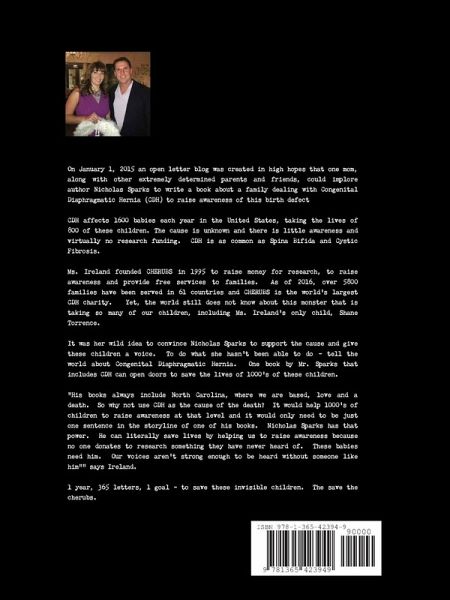 On January 1, 2015 an open letter blog was created in high hopes that one mom, along with other determined parents and friends, could implore author Nicholas Sparks to write a book about a family dealing with Congenital Diaphragmatic Hernia (CDH) to raise awareness of this birth defect CDH affects 1600 babies each year in the United States, taking the lives of 800 of these children. The cause is unknown and there is little awareness and virtually no research funding. CDH is as common as Spina Bifida and Cystic Fibrosis. Ms. Ireland founded CHERUBS in 1995, yet the world still does not know about this monster. It was her wild idea to convince Nicholas Sparks to support the cause and give these children a voice. To do what she hasn't been able to do - tell the world about Congenital Diaphragmatic Hernia. One book by Mr. Sparks that includes CDH can open doors to save the lives of 1000's of these children. 1 year, 365 letters, 1 goal - to save these invisible children. The save the cherubs.