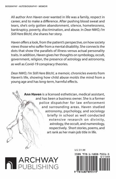 All author Ann Haven ever wanted in life was a family, respect in career, and to make a difference. After pushing blood sweat and tears, she's only gotten abandonment, silence, homelessness, bankruptcy, poverty, discrimination, and abuse. In Dear NWO, I'm Still Here Bitch!, she shares her story. Haven offers a look, from the patient's perspective, on how society views those who suffer from a mental disability. She connects the dots that show the parallels of illness versus actual personality traits. In addition, Haven gives her thoughts on symbology, occult, government, religion, the presence of astrology and astronomy, as well as Covid-19 conspiracy theories. Dear NWO, I'm Still Here Bitch!, a memoir, chronicles events from Haven's life, showing how child abuse molds the mind from a young age and has long-term, harmful effects.