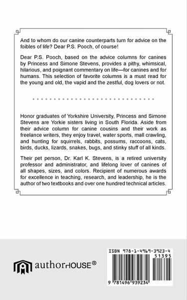 And to whom do our canine counterparts turn for advice on the foibles of life? Dear P.S. Pooch, of course! Dear P.S. Pooch, based on the advice columns for canines by Princess and Simone Stevens, provides a pithy, whimsical, hilarious, and poignant commentary on life?for canines and for humans. This selection of favorite columns is a must read for the young and old, the vapid and the zestful, dog lovers or not.