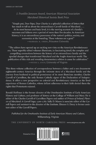 This compelling collection of correspondence between a father and a son documents the history of eighteenth-century America through the intimate story of a family and the journey from boyhood to political prominence of its most illustrious member, Charles Carroll of Carrollton, the only Roman Catholic signer of the Declaration of Independence. Beginning in the late 1740s, when "Papa" (Charles Carroll of Annapolis) sent "Charley" (Charles Carroll of Carrollton) away from his native Maryland to be educated in Europe, the letters present a new perspective on colonial and Revolutionary America as the lived experience of Roman Catholics, whose defiant adherence to their faith denied them the civil rights and guarantees--including the right to hold office and to vote--that their Protestant counterparts enjoyed. This context accentuates the drama of Charley's rise to power during the Revolution, the necessity of the political and economic compromises he felt compelled to make, and the ultimately tragic personal price exacted by his success. Bringing the Carroll's public and private lives sharply into focus, these volumes present the past in its fullest human dimensions.