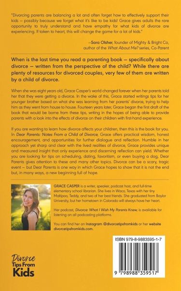 "Divorcing parents are balancing a lot and often forget how to effectively support their kids - possibly because we forget what it's like to be kids! Grace gives adults the rare opportunity to truly understand and have empathy for what kids of divorce are experiencing. If taken to heart, this will change the game for a lot of kids." - Sara Olsher, founder of Mighty & Bright Co, author of the What About Me? series, Co-Parent When is the last time you read a parenting book - specifically about divorce - written from the perspective of the child? While there are plenty of resources for divorced couples, very few of them are written by a child of divorce. When she was eight years old, Grace Casper's world changed forever when her parents told her that they were getting a divorce. In the wake of this, Grace started writings tips for her younger brother based on what she was learning from her parents' divorce, trying to help him as they went from house to house. Fourteen years later, Grace began the first draft of the book that would be borne from these tips, writing in the hopes of being able to provide parents with a look into the effects of divorce on their children with first-hand experience. If you are wanting to learn how divorce affects your children, then this is the book for you. In Dear Parents: Notes From a Child of Divorce, Grace offers practical wisdom, honest encouragement, and opportunities for further dialogue and reflection. Humble in her approach yet sharp and clear with the lived realities of divorce, Grace provides unique and measured insight that only experience and discerning reflection can yield. Whether you are looking for tips on scheduling, dating, favoritism, or even buying a dog, Dear Parents gives attention to these and many other topics. Divorce can be a scary, tragic event - but Dear Parents is one way in which Grace hopes to show that it is not the end but, in many ways, a new beginning full of hope.