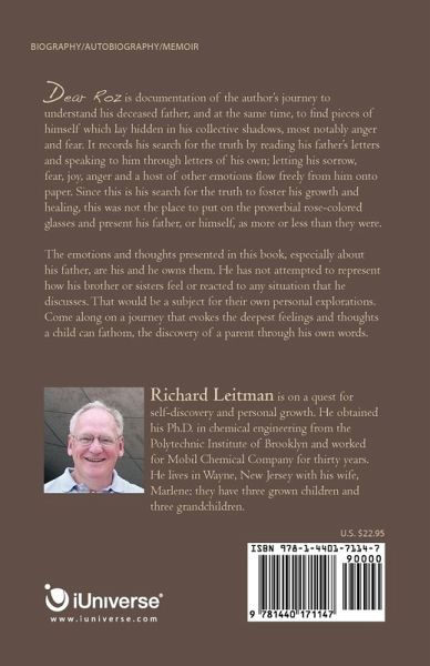 Dear Roz is documentation of the author's journey to find his father, and at the same time, to find pieces of himself which lay hidden in his collective shadows, most notably anger and fear. It records his search for the truth by reading his father's letters and speaking to him through letters of his own; letting his sorrow, fear, joy, anger and a host of other emotions flow freely from him onto paper. Since this is his search for the truth to foster his growth and healing, this was not the place to put on the proverbial rose-colored glasses and present his father, or himself, as more or less than they were. The emotions and thoughts presented in this book, especially about his father, are his and he owns them. He has not attempted to represent how his brother Mark, or his sisters, Susan and Sally, feel or reacted to any situation that he discusses. That would be a subject for their own personal explorations. Come along on a journey that evokes the deepest feelings and thoughts a child can fathom, the discovery of a parent through his own words.