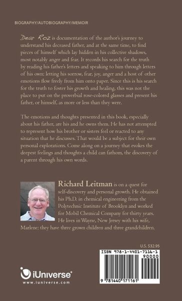 Dear Roz is documentation of the author's journey to find his father, and at the same time, to find pieces of himself which lay hidden in his collective shadows, most notably anger and fear. It records his search for the truth by reading his father's letters and speaking to him through letters of his own; letting his sorrow, fear, joy, anger and a host of other emotions flow freely from him onto paper. Since this is his search for the truth to foster his growth and healing, this was not the place to put on the proverbial rose-colored glasses and present his father, or himself, as more or less than they were. The emotions and thoughts presented in this book, especially about his father, are his and he owns them. He has not attempted to represent how his brother Mark, or his sisters, Susan and Sally, feel or reacted to any situation that he discusses. That would be a subject for their own personal explorations. Come along on a journey that evokes the deepest feelings and thoughts a child can fathom, the discovery of a parent through his own words.